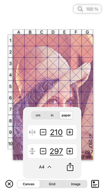 تطبيق Drawing Grid هو تطبيق iPhone مفيد مصمم لمساعدة المستخدمين في الحفاظ على نسبة الكائنات المرسومة. مع هذه الأداة، يمكنك بسهولة تعيين حجم القماش لوضع عناصر الشبكة بدقة، وعرض الأبعاد الفعلية، وضبط خصائص الشبكة لتناسب احتياجاتك الخاصة، سواء كمربعات مربعة أو مربعات بأحجام مخصصة. بالإضافة إلى ذلك، يمكنك تحويل الصور عن طريق ضبط موقعها وحجمها بسهولة.